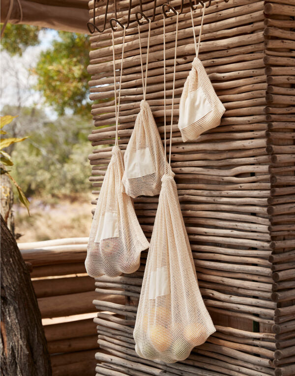 Eco-friendly and versatile mesh sacks made from GOTS-certified organic cotton. Designed for multi-purpose use, including food storage, with a cotton front panel for easy decoration. Features a rope drawcord closure and CutAway label for simple rebranding.